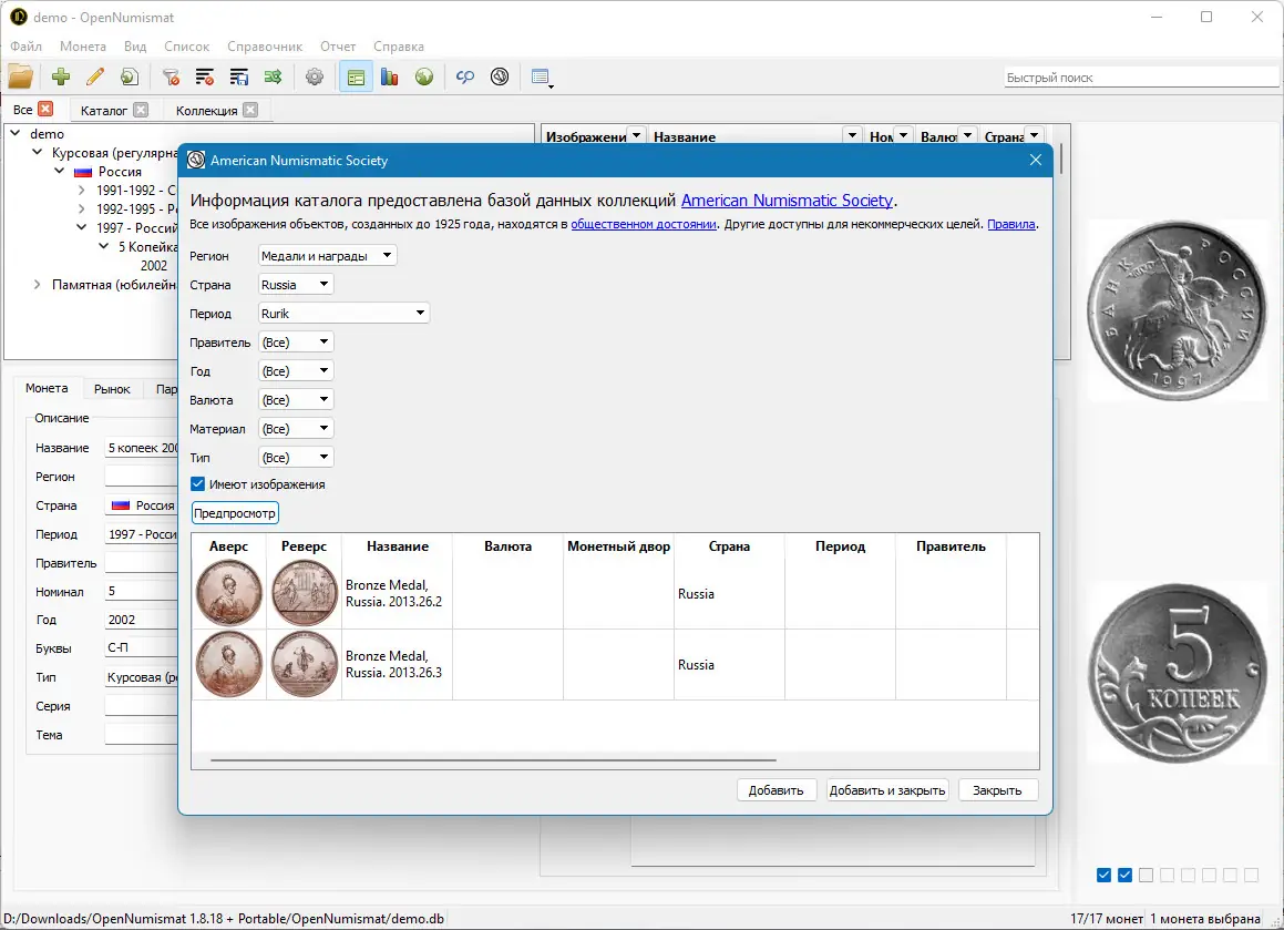 OpenNumismat — это мощное программное обеспечение для ведения и систематизации нумизматических коллекций, позволяющее эффективно управлять данными о монетах, банкнотах и других коллекционных предметах с поддержкой детального описания, фотоархивации и экспорта информации.