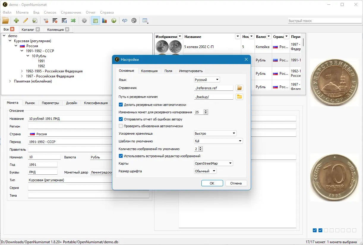 OpenNumismat — это бесплатное приложение для создания и управления нумизматической коллекцией, позволяющее детально описывать монеты, вести учёт покупок и продаж, а также формировать отчёты и статистику. Программа поддерживает импорт данных из различных источников, включая популярные коллекционные платформы, и работает без установки сторонних компонентов. Подходит как для начинающих, так и для опытных коллекционеров, интересующихся монетами, банкнотами и другими объектами нумизматики.