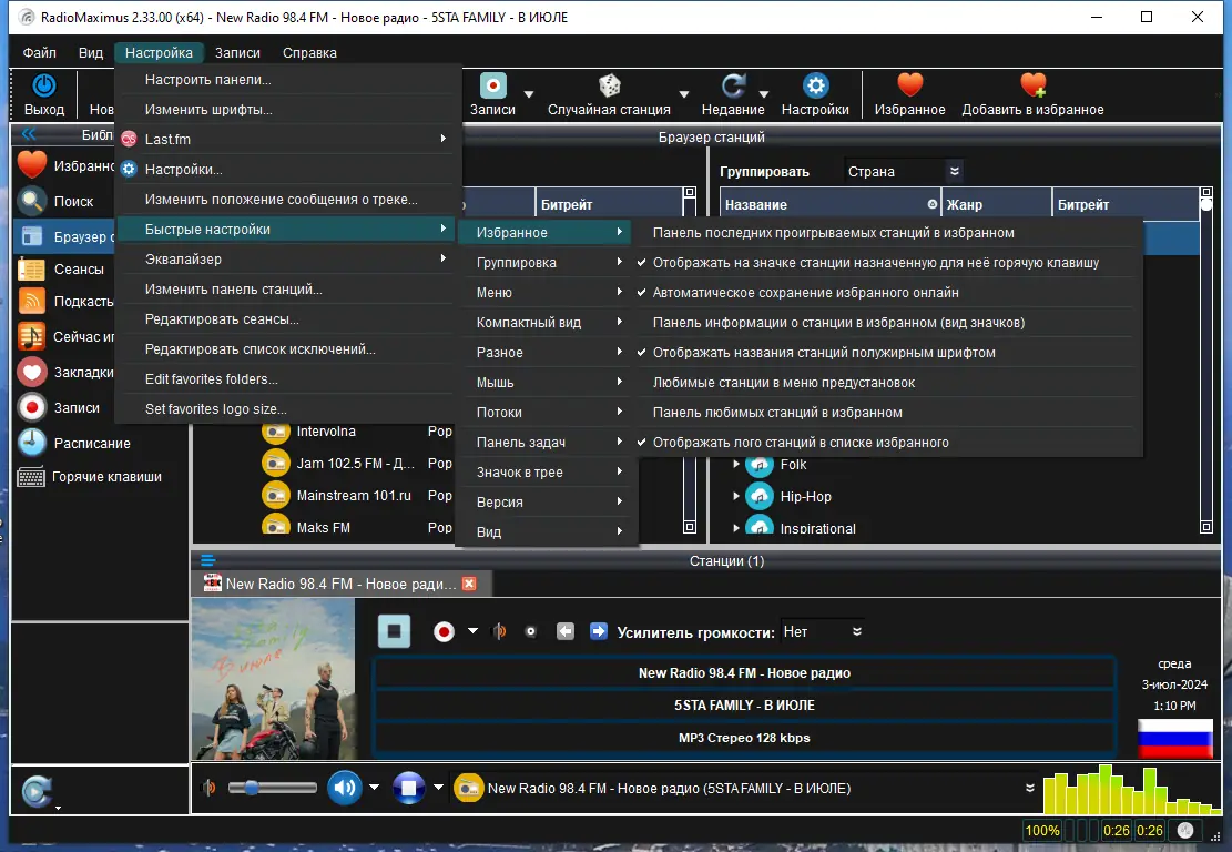 После запуска RadiosMaximus пользователь видит каталог радиостанций, отсортированных по жанрам, странам и популярности. Для начала прослушивания достаточно выбрать нужную станцию — сразу отобразится название текущего трека, обложка, а при наличии — текст песни. Настройка записи осуществляется через вкладку «Запись», где можно указать формат, путь сохранения и активировать автоматическое распознавание композиций. Для фоновой работы поддерживается режим «запись всего эфира» или «только треков». Благодаря интеграции с Last.FM, данные о прослушанных композициях могут синхронизироваться в облако. Дополнительно доступна настройка расписания — программа сама включится в указанное время и запишет нужный эфир.