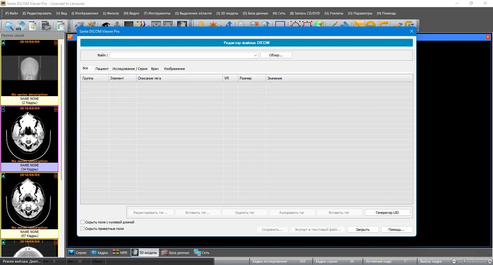 Sante DICOM Viewer Pro — это профессиональное программное обеспечение для работы с медицинскими изображениями в формате DICOM, объединяющее функции просмотра, конвертации, анонимизации и управления данными. Программа поддерживает широкий спектр модальностей, включая КТ, МРТ, УЗИ, рентген и другие, обеспечивая высокую точность визуализации и анализа. Разработанная с нуля без использования сторонних библиотек, она предлагает уникальные инструменты для 2D и 3D реконструкции, работы с PACS и создания мультимедийных отчетов.