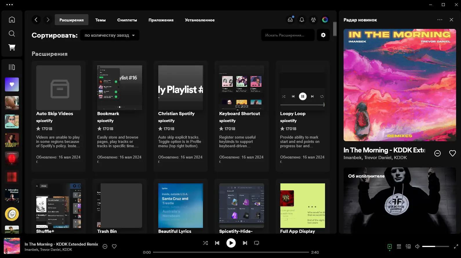 - Поддержка кастомизации интерфейса и тем через Spicetify