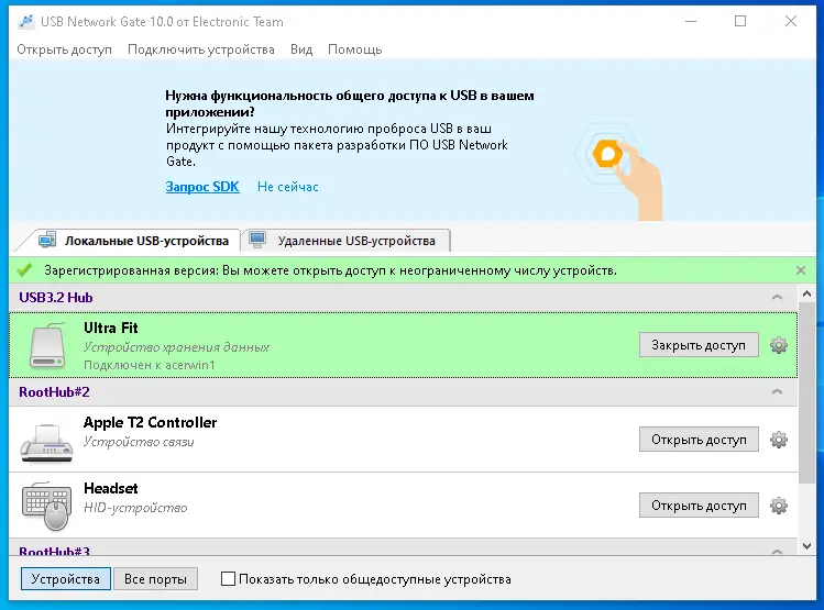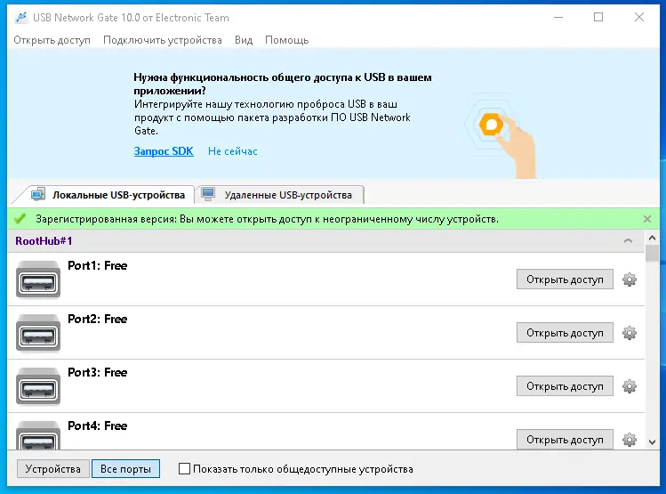 Программа USB Network Gate обеспечивает стабильное и безопасное подключение к USB-устройствам, расположенным на другом конце сети. Это особенно полезно в условиях распределённых офисов, удалённой работы или при необходимости совместного использования оборудования. Технология передачи данных основана на эффективном протоколе, минимизирующем задержки и сохраняющем полную функциональность подключаемых устройств.