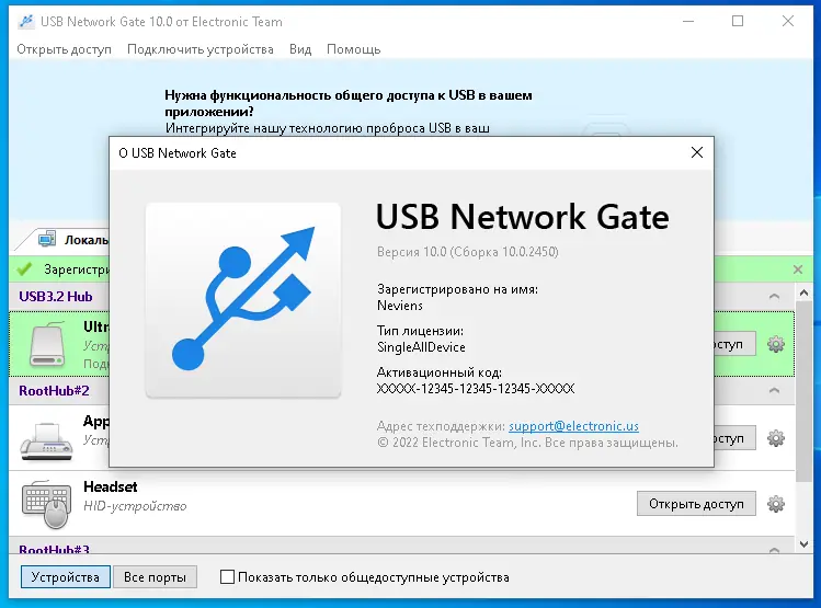 USB Network Gate — это программное решение для удалённого доступа к USB-устройствам через локальную сеть или интернет. Приложение позволяет работать с периферией, подключённой к удалённому компьютеру, как если бы она была физически подключена к вашему ПК. Программа поддерживает широкий спектр устройств, включая принтеры, сканеры, веб-камеры, модемы и защитные ключи.