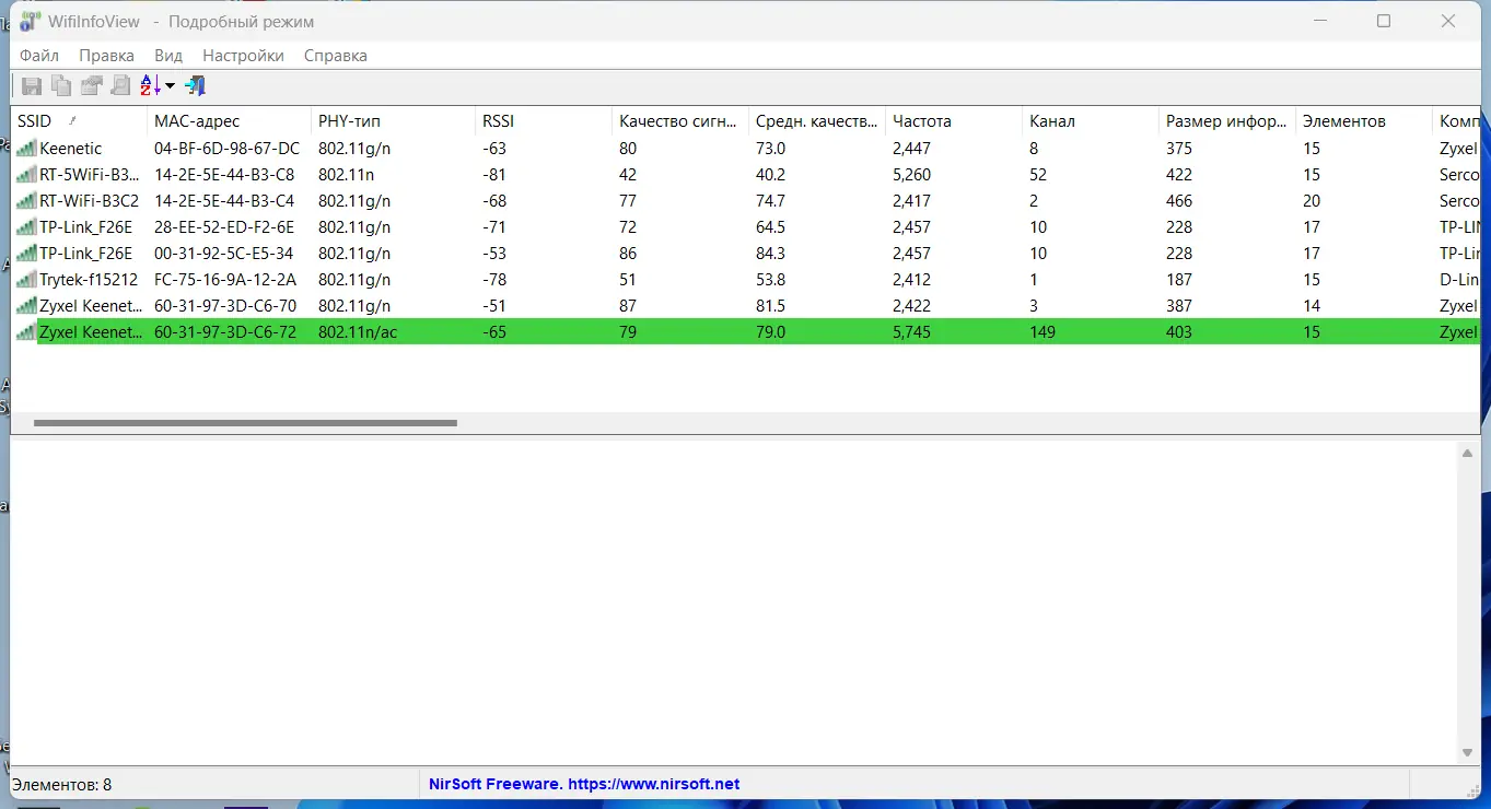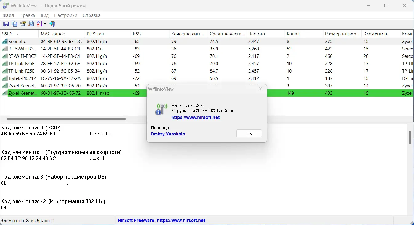 Программа WifiInfoView предоставляет детализированный обзор всех обнаруженных беспроводных сетей в радиусе действия адаптера. Она отображает SSID, MAC-адрес точки доступа, стандарт связи, частоту работы, ширину канала, уровень сигнала и помех, а также информацию о поддержке 802.11ac и 802.11ax. Интерфейс утилиты прост и интуитивно понятен, не перегружен лишними элементами, что позволяет быстро находить нужные данные. В нижней части окна отображается сырая информация в шестнадцатеричном виде, полезная при глубоком анализе сетевых пакетов.