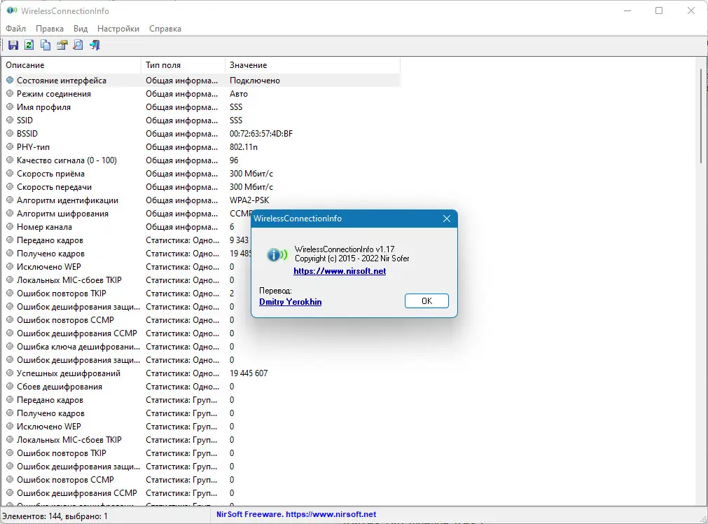WirelessConnectionInfo (Portable) — портативная утилита для просмотра детальной информации о текущем Wi-Fi подключении, включая параметры сети, качество сигнала, скорость передачи данных и статистику обмена. Программа работает без установки и поддерживает русский интерфейс. Подходит для диагностики беспроводных соединений и анализа характеристик подключённой точки доступа.