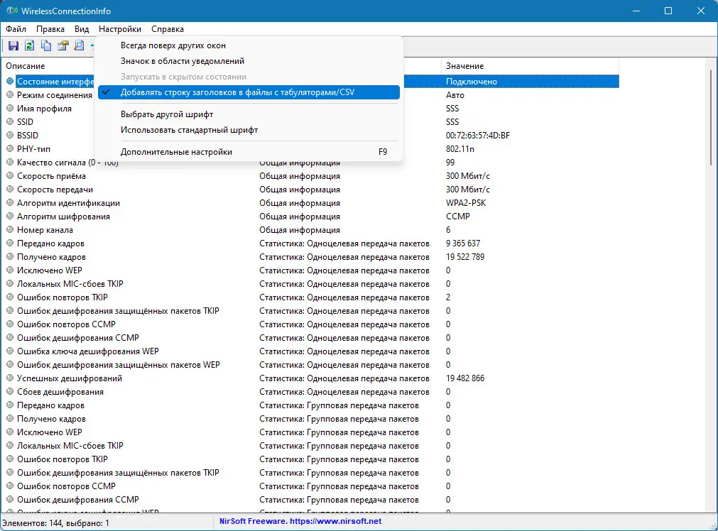 Запуск утилиты осуществляется двойным кликом по исполняемому файлу. После старта отображается окно с полной информацией о текущем подключении к беспроводной сети. Пользователь может скопировать отдельные значения через контекстное меню или экспортировать всю таблицу в файл, используя настройки экспорта. Для включения заголовка в CSV-файл нужно убедиться, что опция ‘Add Header Line To CSV/Tab-Delimited File’ активна — по умолчанию она включена.