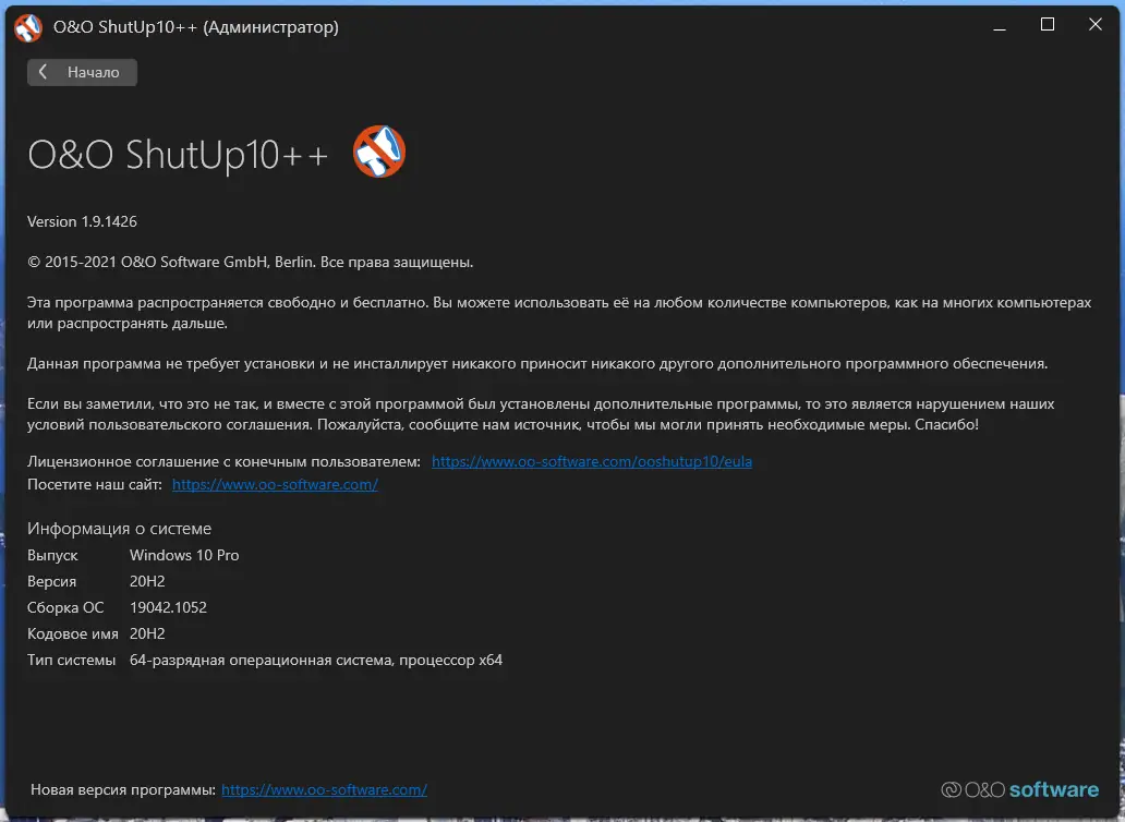 Программа O&O ShutUp10 доступна для бесплатного скачивания и может быть запущена сразу после загрузки. Она совместима с различными версиями Windows, включая 7, 8.1, 10 и 11, как в 32-, так и в 64-битных конфигурациях. Благодаря портативной версии, её можно использовать с флеш-накопителя без установки на жёсткий диск. Инструмент не содержит шпионских модулей, не отправляет данные и не требует регистрации. Поддержка нескольких языков, включая русский, делает её удобной для широкого круга пользователей.
