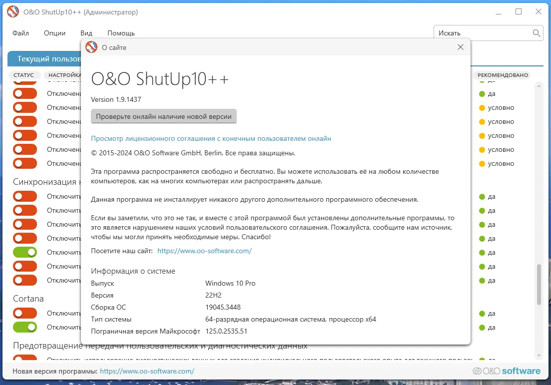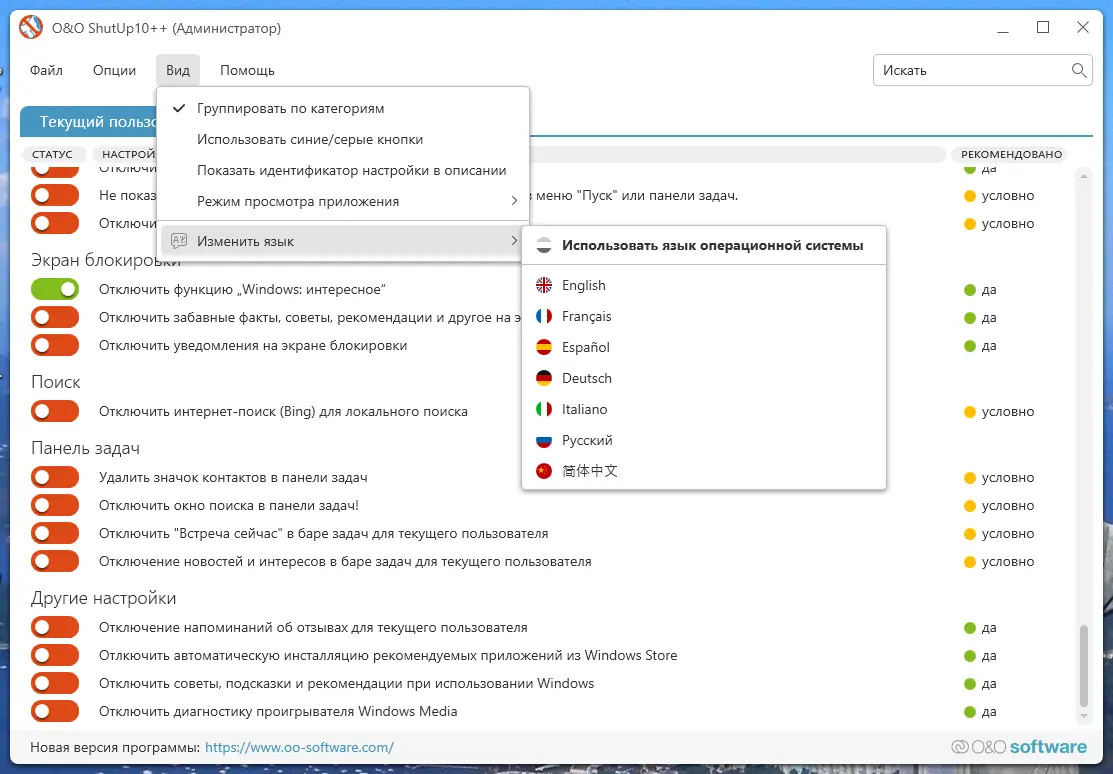 Одним из главных преимуществ O&O ShutUp10 является её простота и при этом высокая эффективность. Программа не замедляет работу системы, не требует установки и совместима с современными версиями Windows. Она работает как с правами обычного пользователя, так и с расширенными привилегиями, что делает её гибкой в использовании. Поддержка нескольких языков, включая русский, упрощает взаимодействие для пользователей из разных регионов.