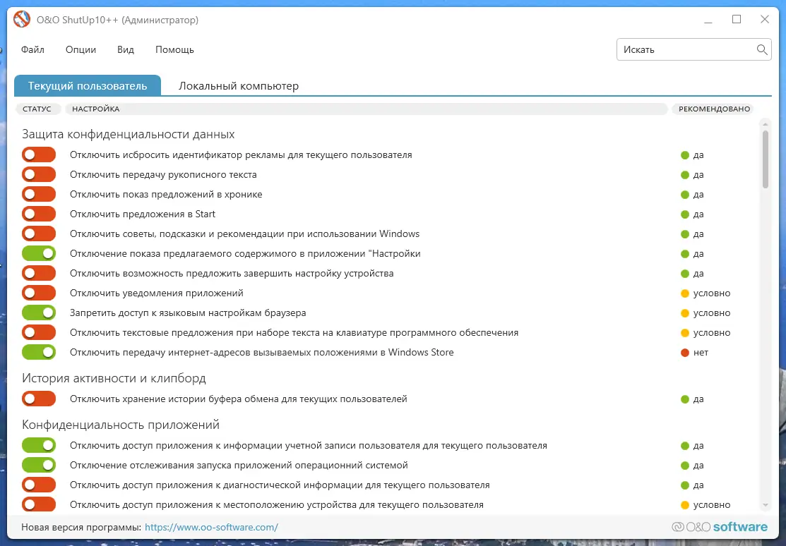 O&O ShutUp10 — это инструмент для тонкой настройки параметров конфиденциальности в операционной системе Windows 10 и выше. Программа позволяет отключить нежелательные функции, связанные со сбором данных, слежением и автоматической передачей информации в облако. Благодаря простому интерфейсу и отсутствию необходимости в глубоких технических знаниях, любой пользователь может быстро усилить защиту своей системы.