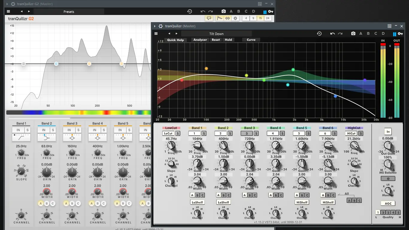 - tranQuilizr и tranQuilizr G2 предлагают многоступенчатую эквализацию с поддержкой различных типов фильтров и режимов обработки каналов, включая Mid/Side и стерео.