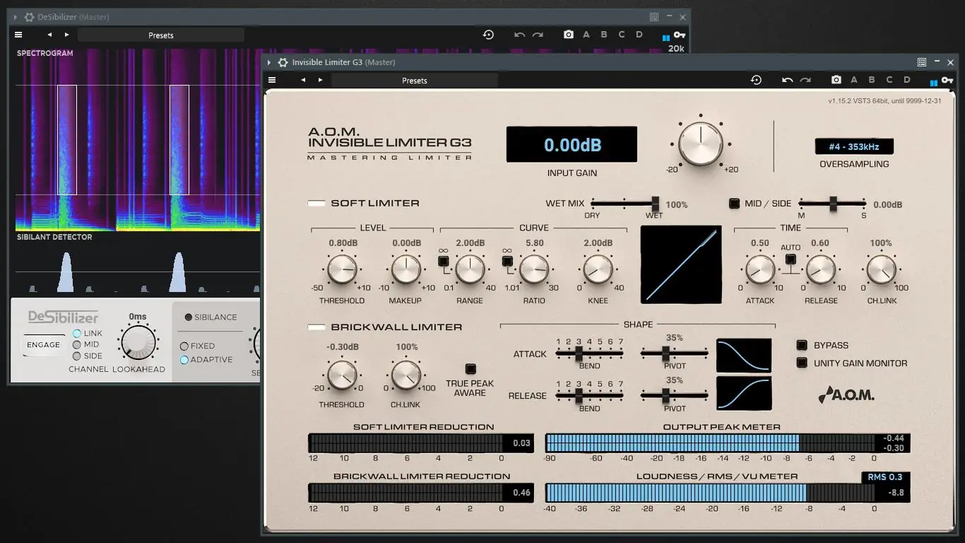 - Плагины Invisible Limiter и его усовершенствованная версия Invisible Limiter G2 обеспечивают надежное ограничение уровня сигнала с возможностью ручной настройки атаки, релиза и формы сжатия.