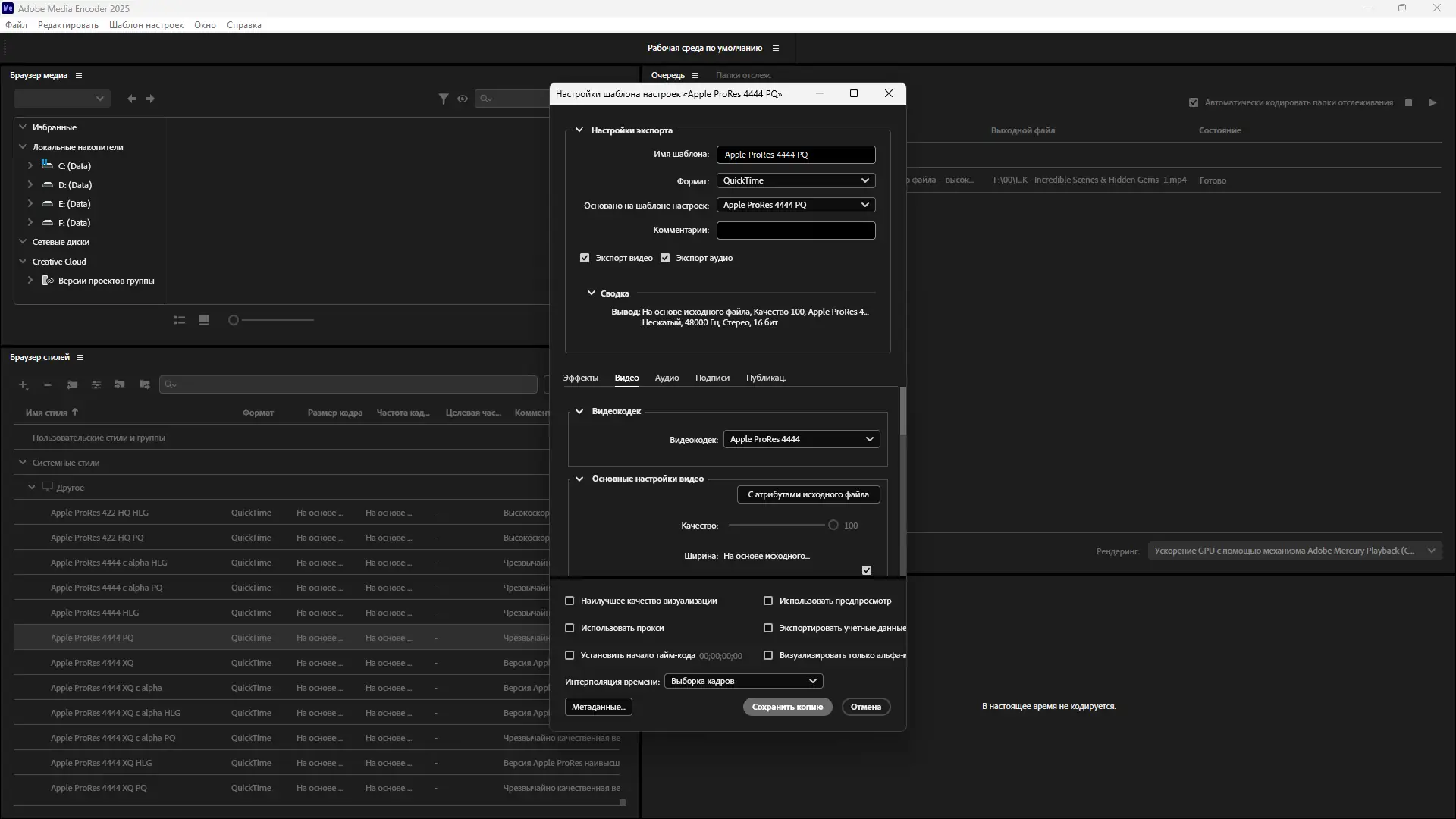 Adobe Media Encoder предоставляет мощные функции для обработки видео и аудио, включая экспорт в популярные форматы, создание прокси-файлов и применение цветовых LUT без перезагрузки проектов. Программа поддерживает широкий диапазон исходных форматов, включая файлы с профессиональных камер, таких как ARRI Alexa LF и Sony Venice v2, а также контент в формате Google VR180. Благодаря встроенной системе управления цветом, пользователи могут точно передавать цветовые схемы на разных дисплеях, обеспечивая консистентность визуального ряда.