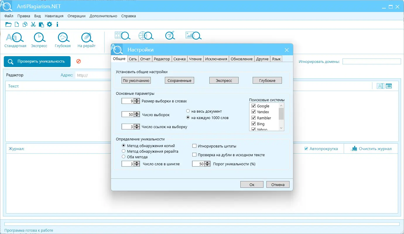 - Поддерживает настройку параметров поиска: длина шинглов, порог уникальности, размер выборки и другие критерии.