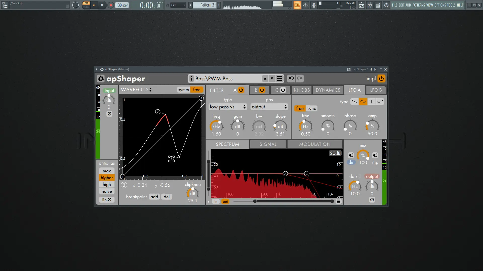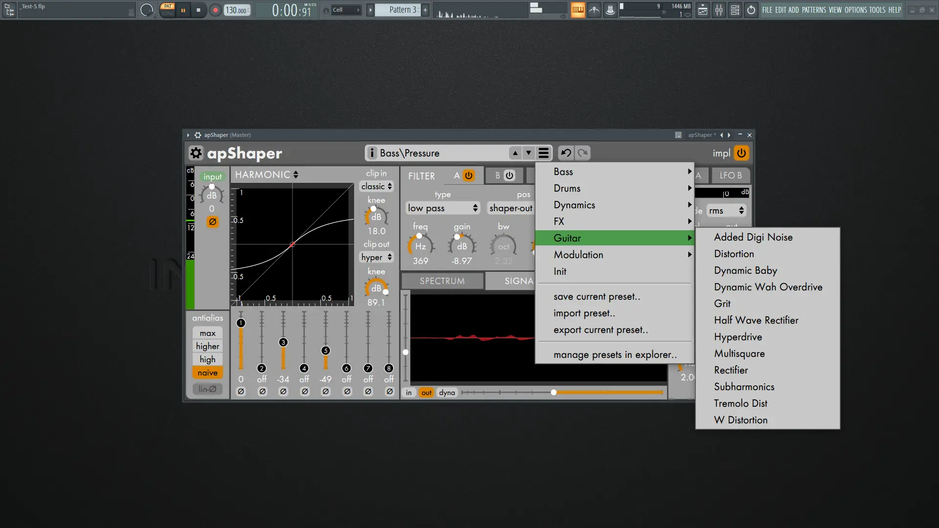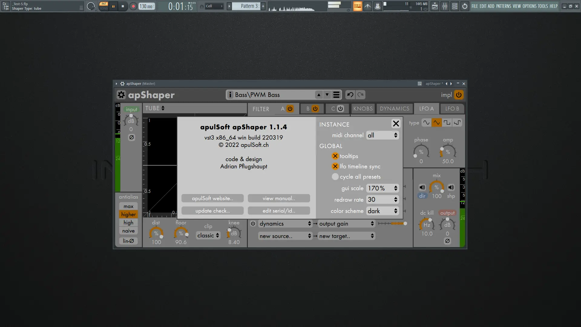 - apShaper — процессор искажений с пятью типами волнового шейпинга, тремя полосами фильтрации и системой модуляции, идеально подходящий для насыщения сигнала гармониками.