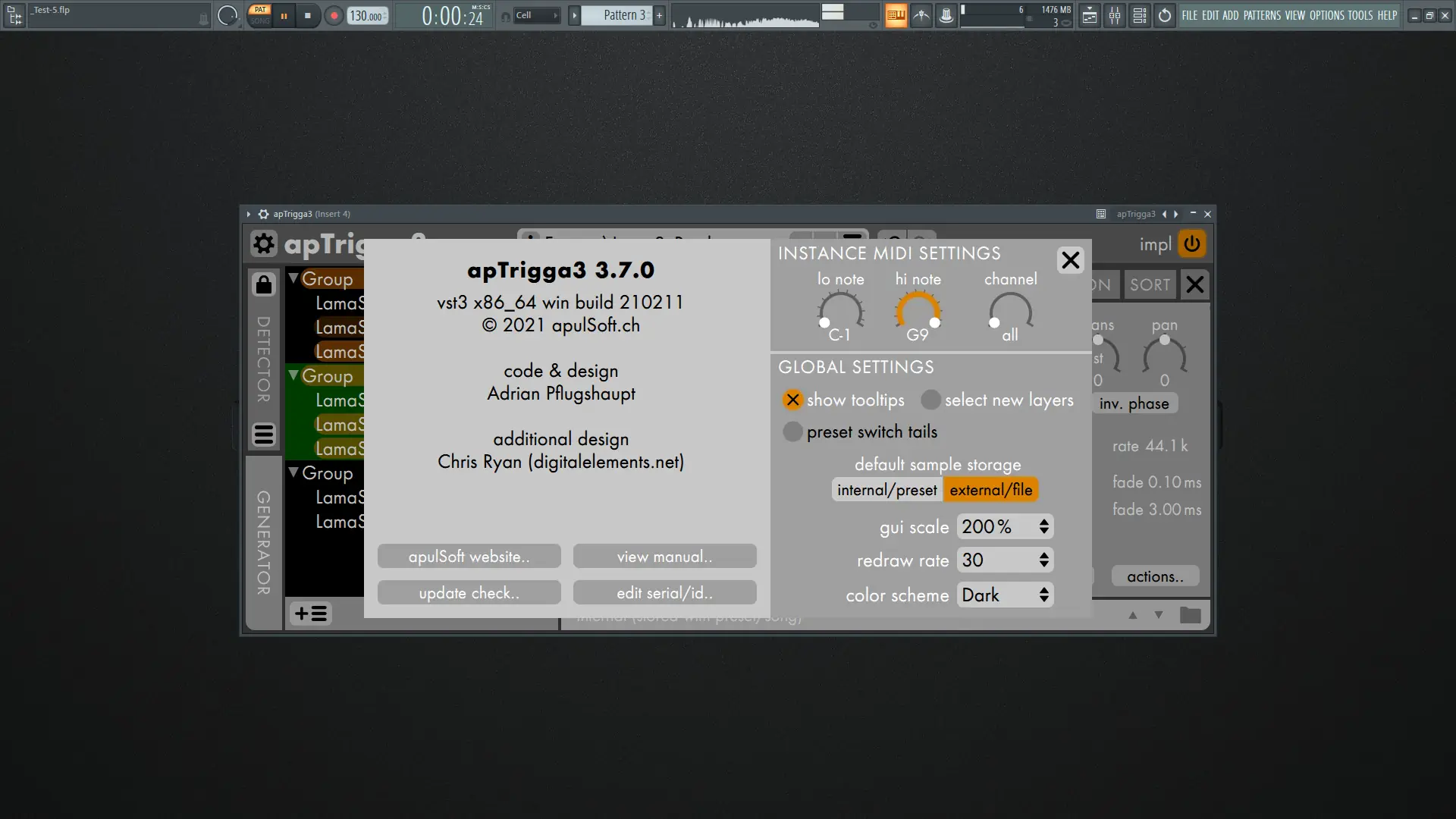 - apTrigga3 — инструмент для преобразования аудиосигнала в перкуссионные элементы, с возможностью записи семплов и модуляции высоты, уровня и фильтрации в зависимости от динамики входа.