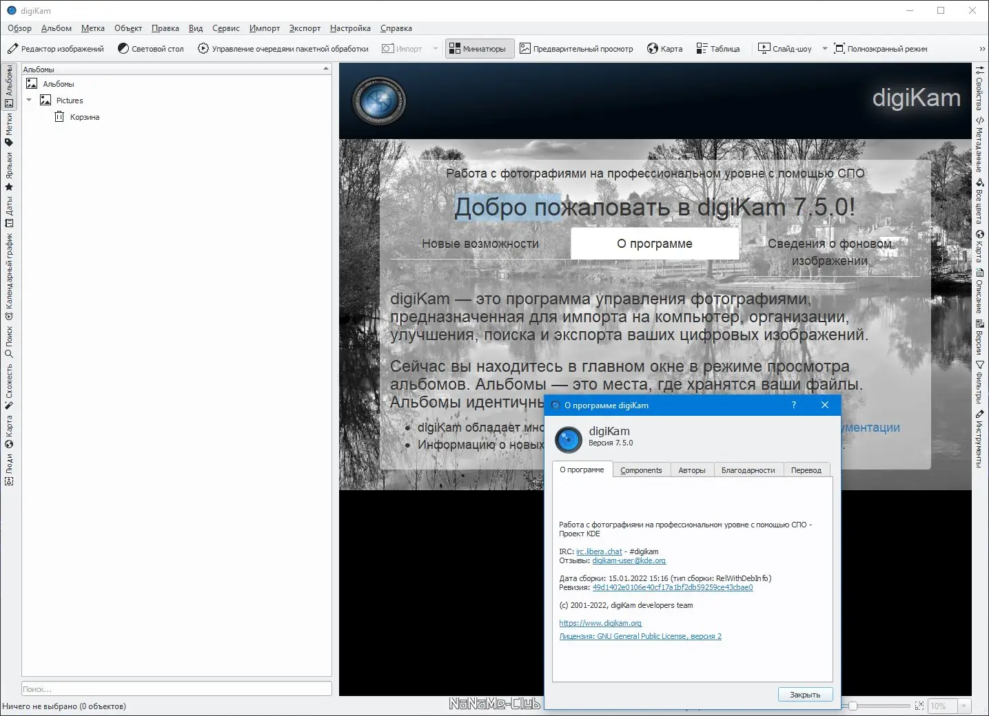digiKam — это мощный photo manager, предназначенный для систематизации, просмотра и обработки цифровых изображений. Программа поддерживает широкий спектр форматов, включая RAW, и позволяет эффективно управлять коллекциями фотографий с помощью интеллектуальной каталогизации, тегирования и поиска по метаданным. Она одинаково хорошо подходит как для любителей, так и для профессионалов, работающих с большим объёмом снимков.