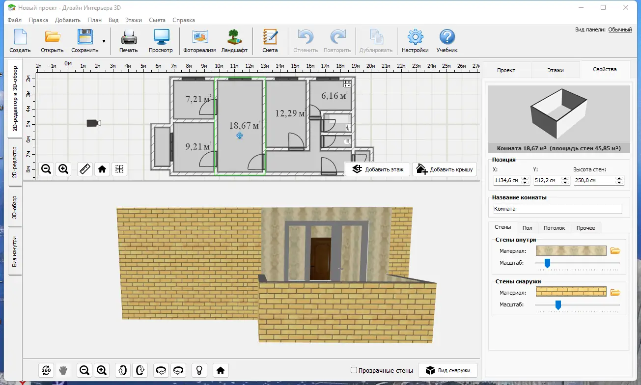 Работа с программой начинается с создания контура помещения, где задаются длина и ширина стен. После этого можно добавлять дверные и оконные проёмы, указывая их точные размеры и расположение. Далее пользователь выбирает текстуры для пола, стен и потолка, подбирая материалы из встроенной коллекции. Следующий этап — расстановка мебели и техники, которую можно масштабировать, поворачивать и перемещать с помощью перетаскивания. Все изменения отображаются в режиме реального времени в 3D-окне. При необходимости можно сохранить несколько версий одного проекта для сравнения. Программа также поддерживает использование типовых планировок, что ускоряет начало работы.