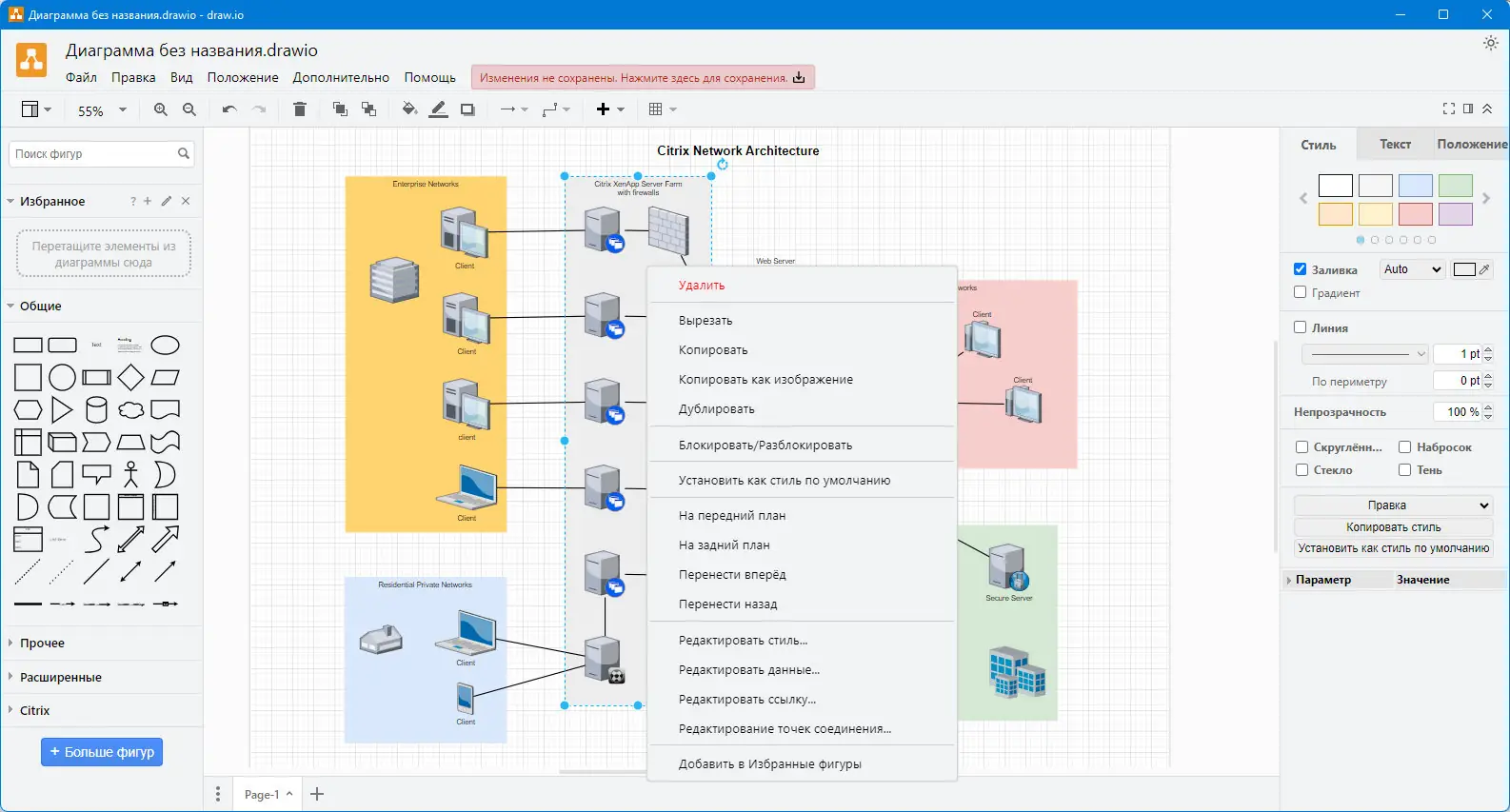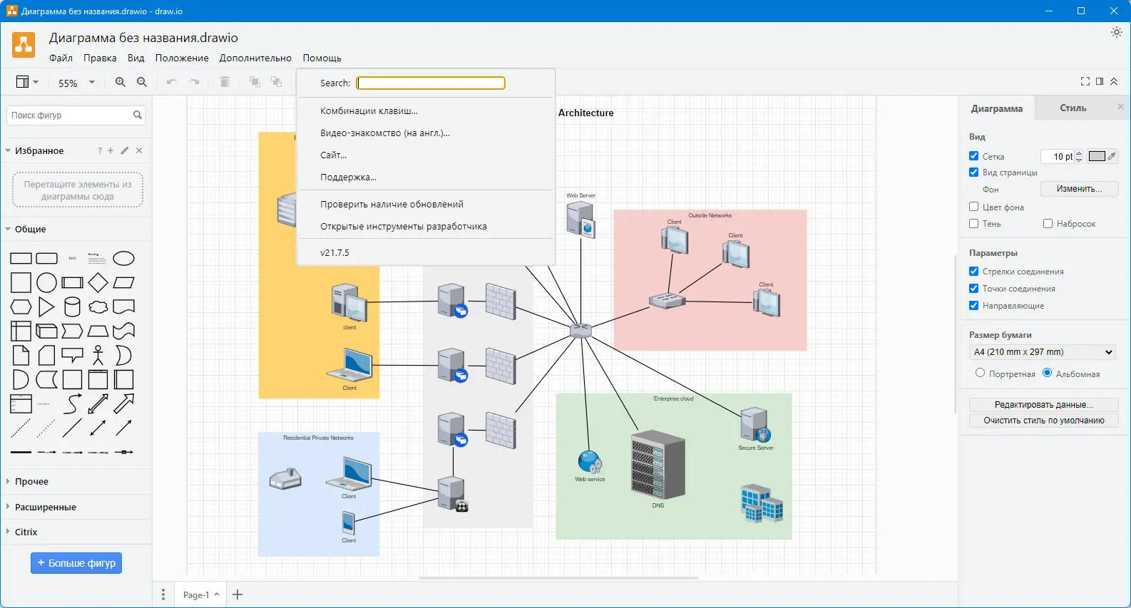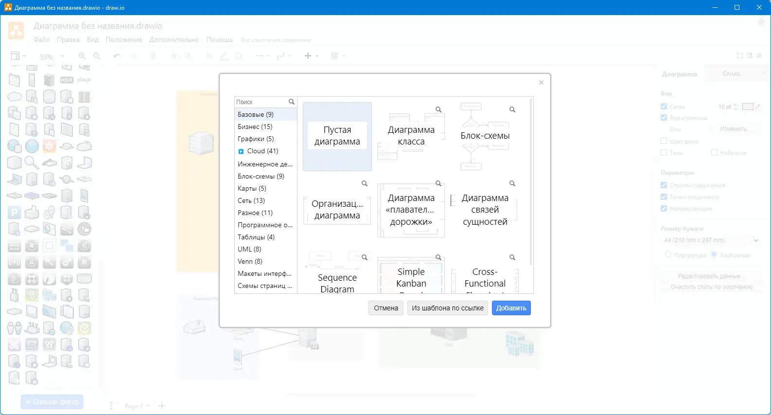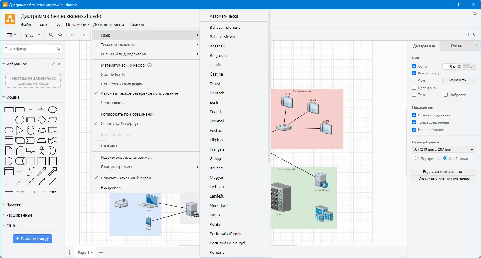 - Поддержка различных типов диаграмм, включая UML и сетевые схемы