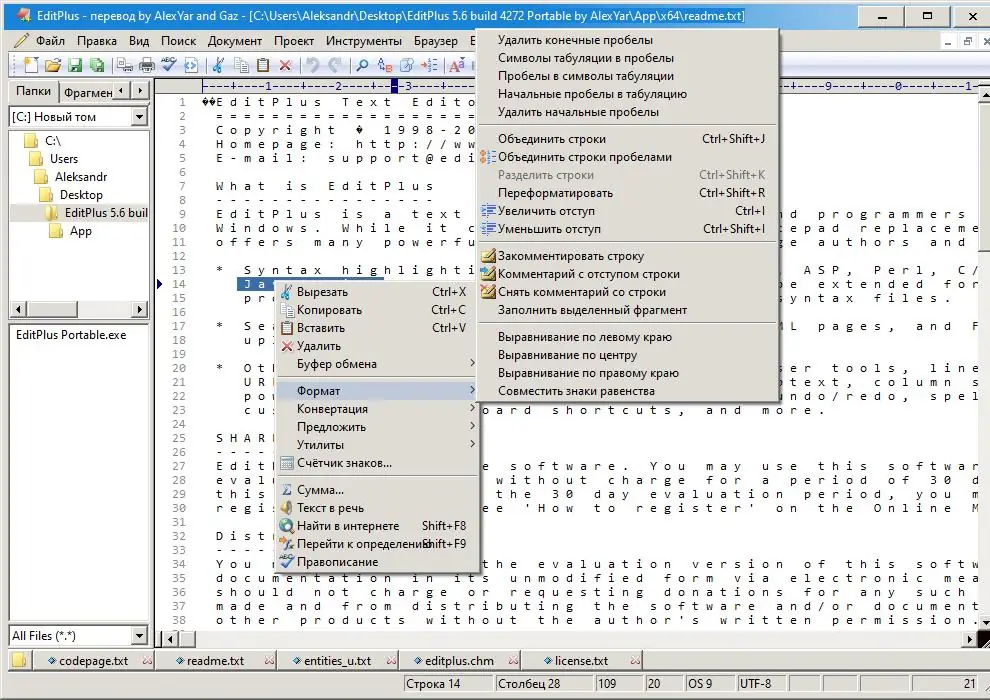 EditPlus зарекомендовал себя как надёжный инструмент для программистов и веб-разработчиков, сочетающий функциональность и лёгкость в использовании. Программа позволяет эффективно управлять множеством открытых файлов, настраивать интерфейс под индивидуальные предпочтения и автоматизировать повторяющиеся действия. Поддержка версии 6.0 build 765 portable обеспечивает возможность запуска без установки, что удобно для использования на разных компьютерах. В последних версиях реализована поддержка тёмной темы в Windows 10 и 11, улучшена работа с SFTP-серверами и исправлены ошибки, связанные с FTP-синхронизацией и отображением путей в заголовке окна.