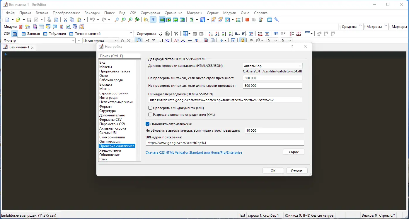 Использование Emurasoft EmEditor не требует глубоких технических знаний, однако его функционал максимально раскрывается при настройке под индивидуальные задачи. После запуска можно открыть файл напрямую через проводник или перетащить его в окно редактора с помощью drag & drop. Для настройки подсветки синтаксиса выбирается соответствующая конфигурация в меню «Сервис», где можно импортировать сторонние файлы с расширением .esy. Темы оформления также легко импортируются через раздел «Свойства для всех конфигураций», что позволяет персонализировать внешний вид под рабочие предпочтения, например, активировать тёмную тему для снижения нагрузки на глаза.