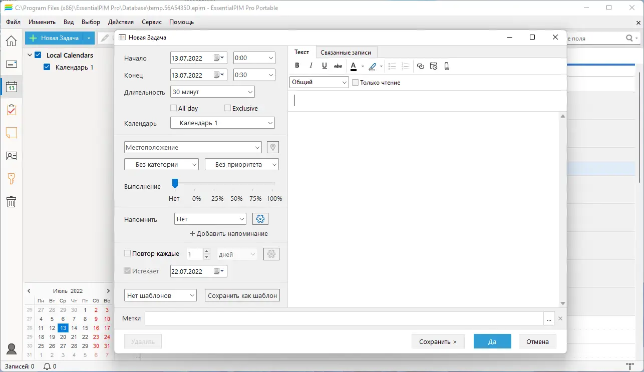 Запуск EssentialPIM не требует сложной настройки — интерфейс готов к использованию сразу после установки. Каждый модуль доступен через боковую панель, где можно быстро переключаться между календарём, делами, заметками и контактами. Для новых пользователей предусмотрены шаблоны и подсказки, ускоряющие освоение функций.