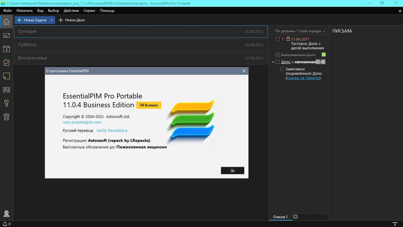 EssentialPIM — это универсальный менеджер персональной информации, объединяющий календарь, задачи, заметки, контакты и почту в единой среде. Программа поддерживает синхронизацию с популярными сервисами, включая Outlook и Google Calendar, и предлагает надёжное шифрование данных. Подходит как для личного использования, так и для командной работы в сетевом режиме.