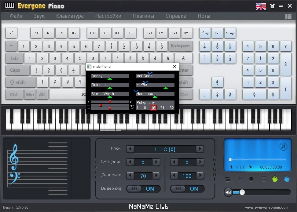 Everyone Piano — это бесплатный виртуальный синтезатор с интерфейсом пианино, позволяющий играть с помощью клавиатуры компьютера или подключённой MIDI-клавиатуры. Программа поддерживает запись и воспроизведение музыкальных композиций, настройку октав, аккомпанемент и использование внешних звуковых модулей. С её помощью можно обучаться игре на фортепиано, развивать слух и изучать ноты в удобной интерактивной форме.