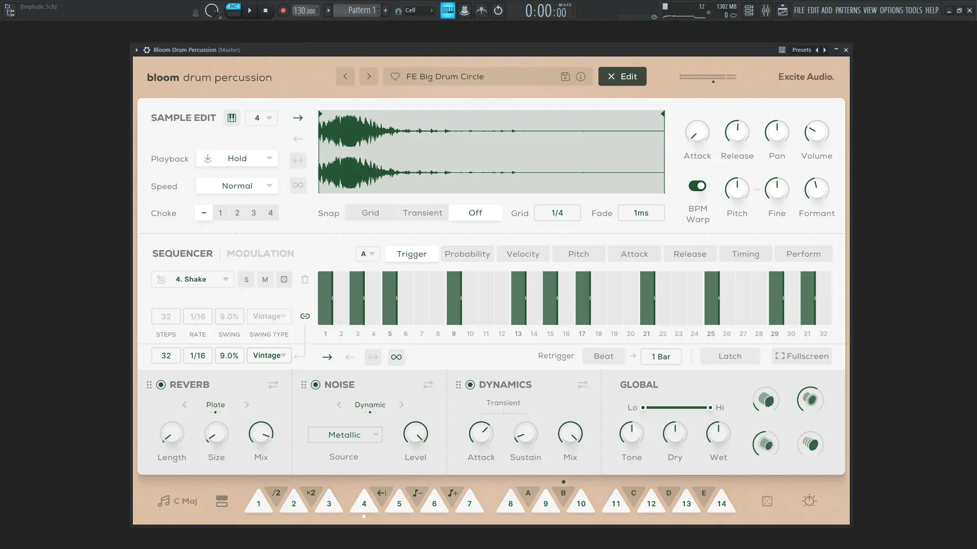 Работа с Bloom Drum Percussion начинается с загрузки плагина в DAW. После запуска доступны 14 клавиш, каждая из которых может быть назначена на определённый сэмпл из выбранного банка. Пользователь может выбрать конкретную клавишу вручную или использовать функцию случайного выбора, чтобы генерировать непредсказуемые ритмические комбинации. Секвенсор позволяет настраивать ритмические паттерны с помощью встроенных модификаторов, таких как Half-time, Double-Time, Reverse и октавные сдвиги. Пять пользовательских модификаторов дают возможность запускать сложные последовательности и создавать динамичные переходы в треках. Эффекты Drive, Slap Delay, Multi Delay и Lo-Fi, а также основные параметры шумоподавления, реверберации и динамики, позволяют детально формировать звук. Все изменения можно отключить с помощью глобального Bypass, что удобно при сравнении обработанного и исходного сигнала.