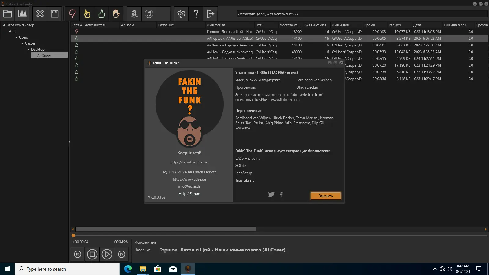 Программа Fakin The Funk анализирует аудиофайлы, выявляя расхождения между заявленными и реальными параметрами качества. Она определяет, был ли файл перекодирован из более низкого битрейта, например, из 128 кбит/с в 320 кбит/с, что часто встречается при скачивании музыки из сомнительных источников. Анализ осуществляется автоматически, с возможностью пакетной обработки, что значительно ускоряет проверку больших библиотек.