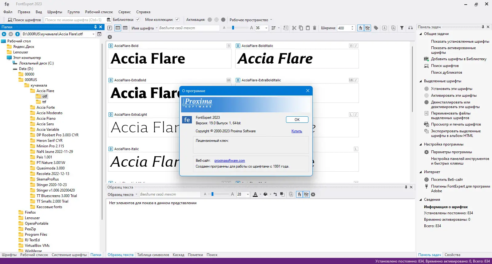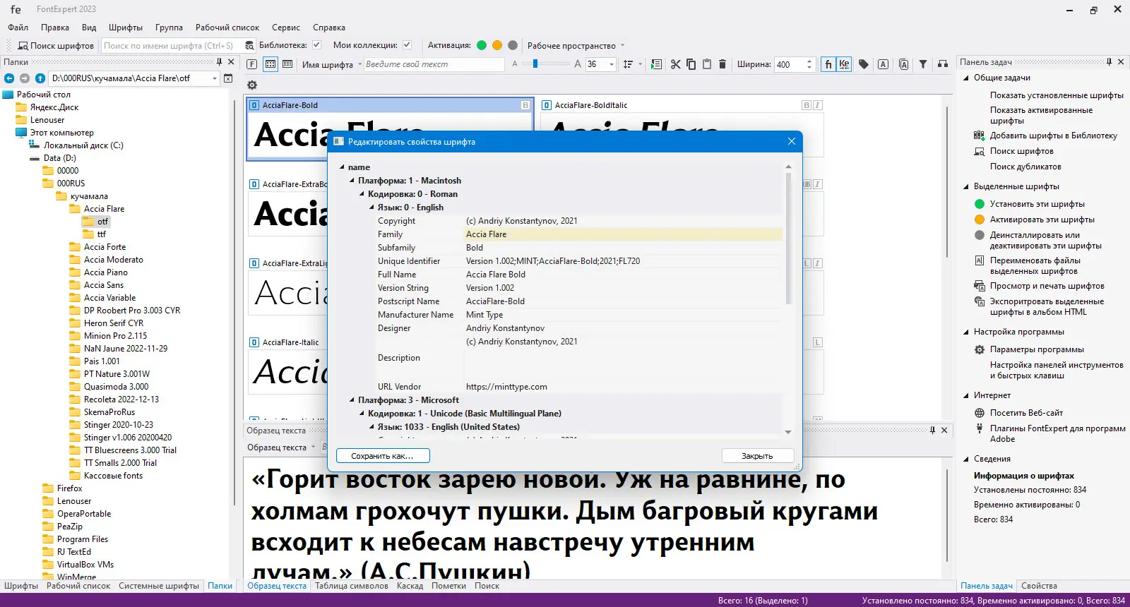 - Предварительный просмотр шрифтов в различных режимах: текст, таблица символов, образец.