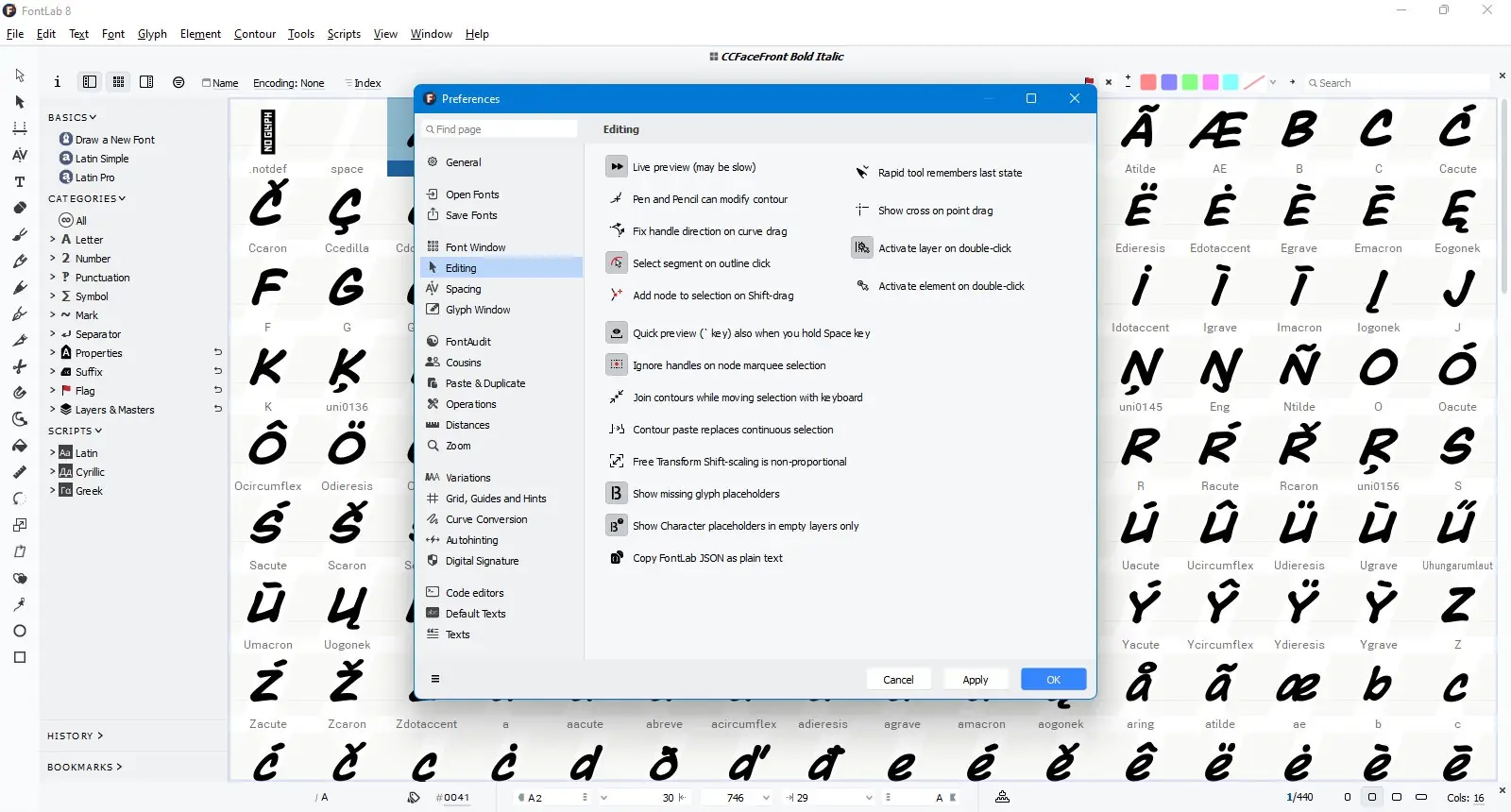 Работа с FontLab начинается с создания нового проекта или импорта существующего шрифта. Пользователь может нарисовать глифы с помощью инструментов Безье или импортировать контуры из векторных редакторов. Далее настраивается кернинг, интервалы, метрики и параметры хинтинга. Программа позволяет визуализировать шрифт в различных начертаниях, проверять его отображение в разных системах и экспортировать в нужный формат. Поддержка drag and drop упрощает организацию наборов символов, а встроенные фильтры помогают быстро применять изменения ко всей группе глифов.
