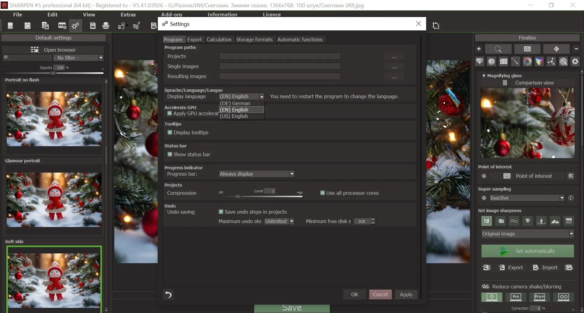 Интерфейс Franzis SHARPEN интуитивно понятен: после загрузки изображения пользователь выбирает подходящий пресет или активирует автоматическую коррекцию. Встроенный предпросмотр в режиме реального времени позволяет сравнивать оригинал и результат, что упрощает контроль изменений. Дополнительные инструменты, такие как макрофункция, выборочная резкость и 3D-освещение, доступны через отдельные модули.