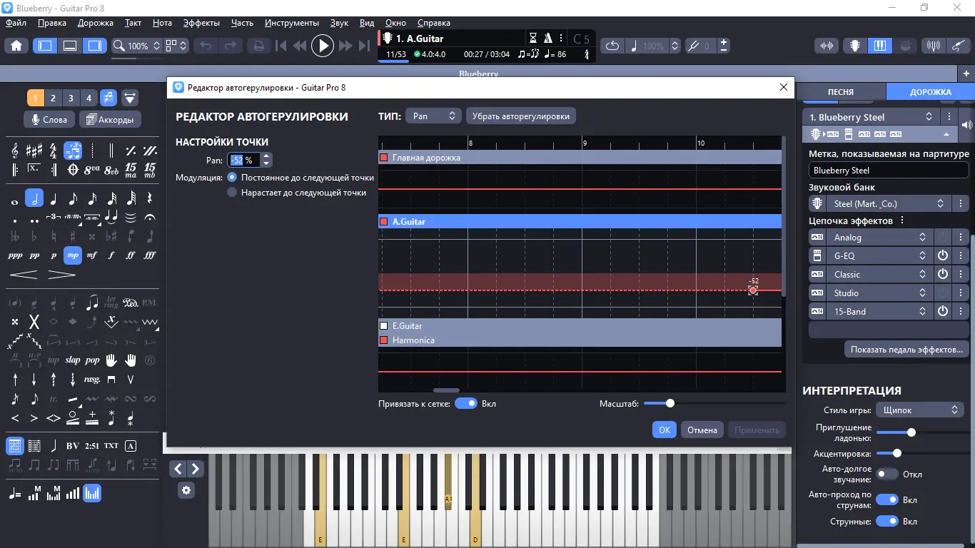 Интерфейс Guitar Pro интуитивно понятен и организован так, чтобы музыкант мог быстро начать создавать или редактировать табулатуры. Добавление нот, аккордов и музыкальных символов осуществляется через встроенные панели инструментов и контекстные меню. Для обучения доступна функция заморозки звучания аккордов, позволяющая отрабатывать аппликатуру под постоянный звук. Также можно включить визуальный метроном, который помогает выдерживать ритм и оттачивать технику исполнения.