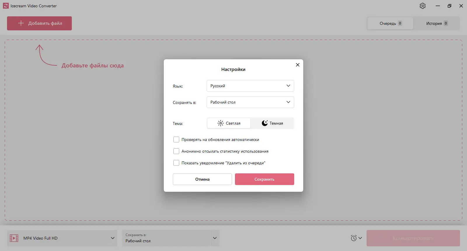 Программа сохраняет историю всех конвертаций, что упрощает доступ к ранее обработанным файлам и управление ими.
