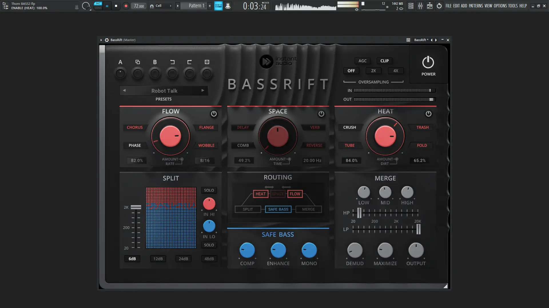 Instant Audio предлагает комплексное решение для работы с басом в музыкальных проектах. Благодаря технологии частотного разделения, сигнал разделяется на низкие и высокие составляющие, каждая из которых обрабатывается отдельно. Это позволяет усилить мощь низких частот, не затрагивая верхние, и наоборот — добавить текстуру и движение верхней части сигнала, не перегружая микс.
