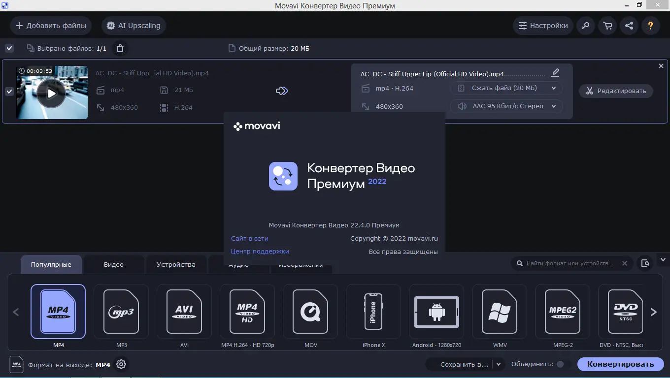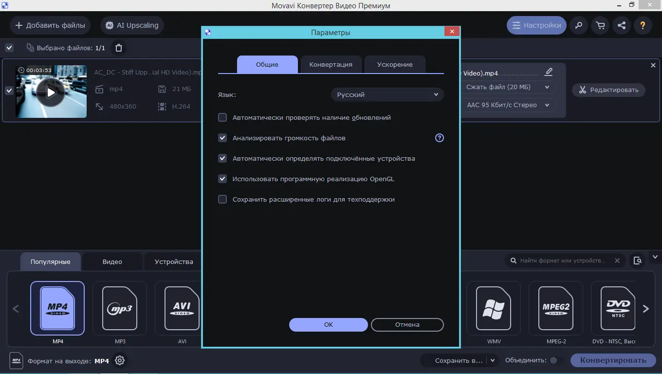 Movavi Video Converter — это мощное приложение для конвертации видео и аудио, позволяющее быстро и без потерь преобразовывать медиафайлы в нужные форматы. Программа работает с такими форматами, как AVI, MP4, MKV, FLV, WebM, MOV, а также поддерживает аудиокодеки MP3, FLAC, OGG и WMA. Благодаря встроенным профессиональным фильтрам, можно улучшить качество изображения, устранить шумы, настроить цветокоррекцию и изменить соотношение сторон.