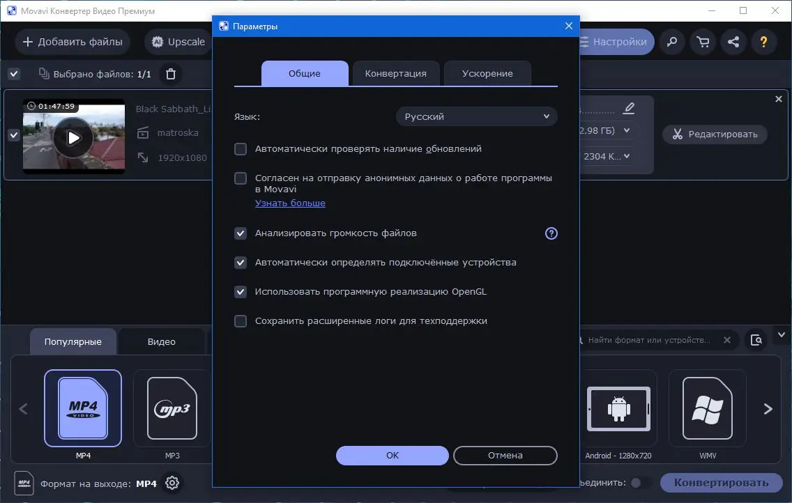 Интерфейс Movavi Video Converter интуитивно понятен и не требует глубоких знаний в области видеоредактирования. Для начала работы достаточно добавить файл, выбрать целевой формат или устройство из списка профилей, при необходимости настроить параметры вручную или обрезать видео маркерами. Запуск конвертации осуществляется одной кнопкой, а процесс можно отслеживать в реальном времени с возможностью приостановки и возобновления. Программа также позволяет извлекать аудиодорожки из видео и сохранять их в отдельные файлы.