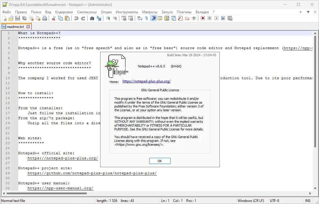 Notepad++ построен на базе компонента Scintilla, написанного на C++ с использованием Win32 API и стандартной библиотеки шаблонов (STL), что обеспечивает высокую производительность и минимальное потребление системных ресурсов. Редактор распространяется под лицензией GPL, что гарантирует свободу использования, модификации и распространения. Его функционал значительно превосходит возможности стандартного блокнота, предлагая профессиональные инструменты для эффективной работы с текстом и исходным кодом.
