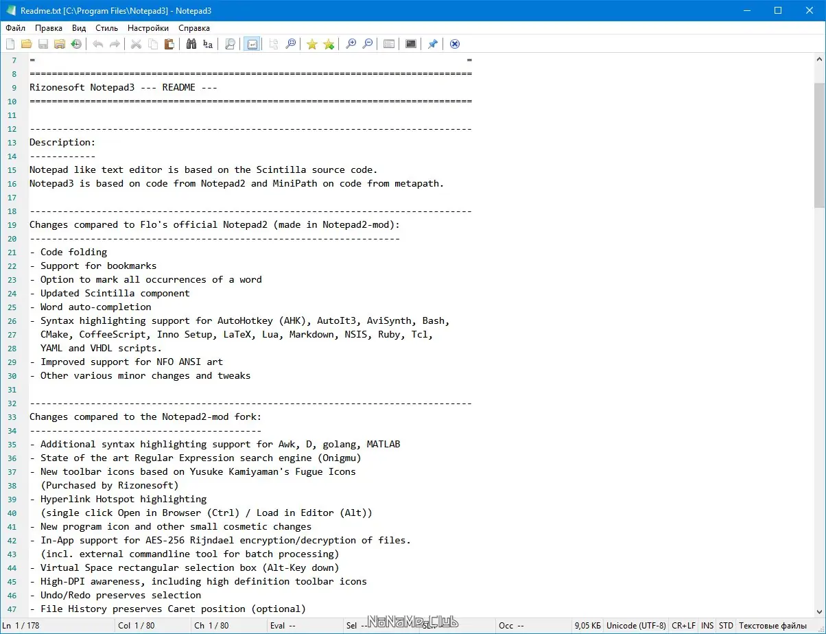 Notepad3 — это легковесный и функциональный текстовый редактор, основанный на движке Scintilla, предназначенный для работы с кодом и обычным текстом. Программа предлагает продвинутые инструменты редактирования, включая подсветку синтаксиса, работу с различными кодировками и поддержку множества языков программирования. Благодаря своей компактности и высокой производительности, она становится достойной заменой стандартному Блокноту Windows.