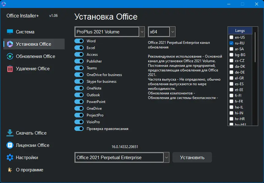 Утилита доступна для скачивания в различных редакциях, включая версию с расширенными возможностями активации. Поддерживается установка на операционные системы Windows 7, 8.1, 10 и 11 разрядности x86 и x64. Программа распространяется с лицензией, соответствующей условиям использования Microsoft Office, и включает в себя только инструменты развёртывания, без нарушения авторских прав. Русский интерфейс делает её доступной для пользователей из стран СНГ. Автоматизация, поддержка конфигураций и гибкость в работе с дистрибутивами делают Office Installer надёжным помощником при настройке офисного окружения.