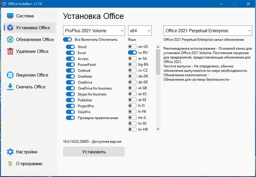 Office Installer — это инструмент для установки Microsoft Office 2016 и 2024 версий по технологии Click-to-Run как в онлайн, так и в оффлайн-режиме. Программа позволяет создавать полноценные локальные установочные пакеты, включая поддержку нескольких языков и разрядностей. Подходит для системных администраторов и обычных пользователей, которым нужна гибкость при развёртывании офисного пакета.