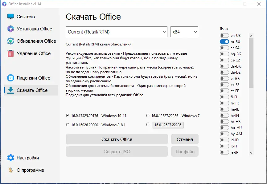 Для корректной работы с Office Installer рекомендуется сначала удалить существующую версию Office через встроенные средства программы. После этого можно перейти к установке новой версии, выбрав нужную редакцию, разрядность и язык. Для создания оффлайн-установщика используется вкладка «Скачать Office», где пользователь указывает папку для сохранения файлов. При необходимости можно дополнить уже загруженный дистрибутив другими компонентами или языками, просто выбрав ту же папку. После завершения загрузки доступна функция создания ISO-образа, который можно записать на диск или флешку. Также поддерживается автоматическая установка через ключ /install при наличии конфигурационного файла Office Installer.ini.