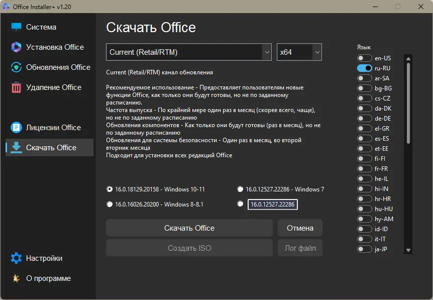 - Поддержка установки Microsoft Office 2016 и 2024 через C2R
