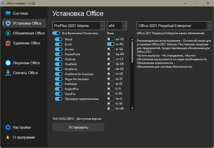 Office Installer — это инструмент для установки офисных пакетов Microsoft Office 2016 и 2024 в режиме online или offline. Программа позволяет создавать собственные дистрибутивы, управлять лицензиями и настраивать установку под конкретные требования. Подходит как для домашнего, так и для корпоративного использования.