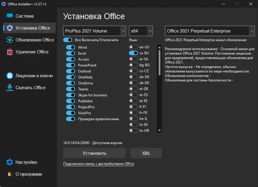Office Installer представляет собой утилиту, ориентированную на работу с установкой и настройкой офисного пакета от Microsoft. Основной функционал включает установку, удаление и подготовку оффлайн-дистрибутивов для Microsoft Office 2016 и 2024 версий. Программа поддерживает C2R-метод развёртывания, что обеспечивает совместимость с современными системами и позволяет обходить типичные сложности при инсталляции. В отличие от стандартных установщиков, этот инструмент даёт полный контроль над процессом — от выбора компонентов до формирования загрузочного образа.