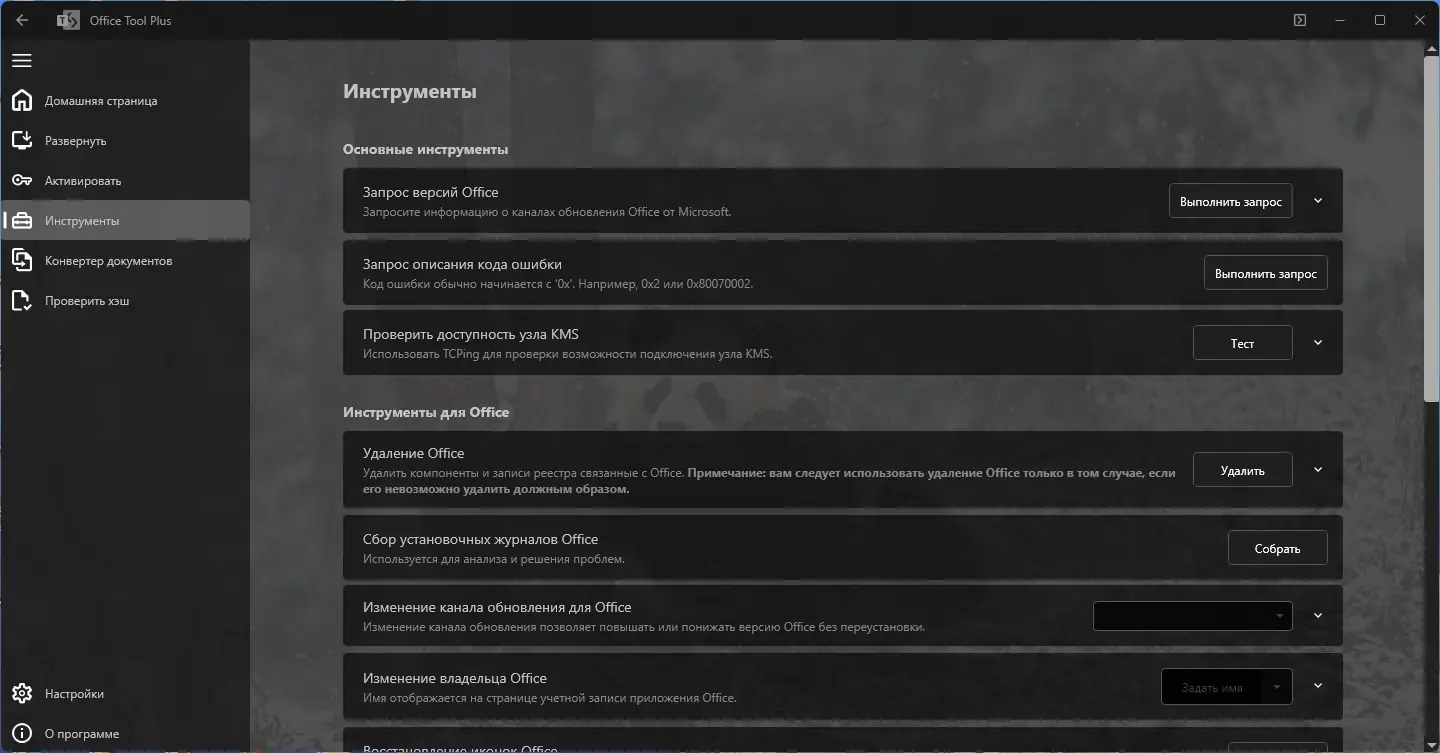 Office Tool Plus — это мощный инструмент для управления установкой, настройкой и активацией пакета Microsoft Office. Программа позволяет загружать, настраивать и удалять офисные приложения с высокой точностью, поддерживает различные версии Office, включая Microsoft 365, Office 2016–2021, Visio и Project. С её помощью можно легко изменить канал обновления, удалить ненужные компоненты, создать образ ISO и подготовить конфигурацию для массового развёртывания.