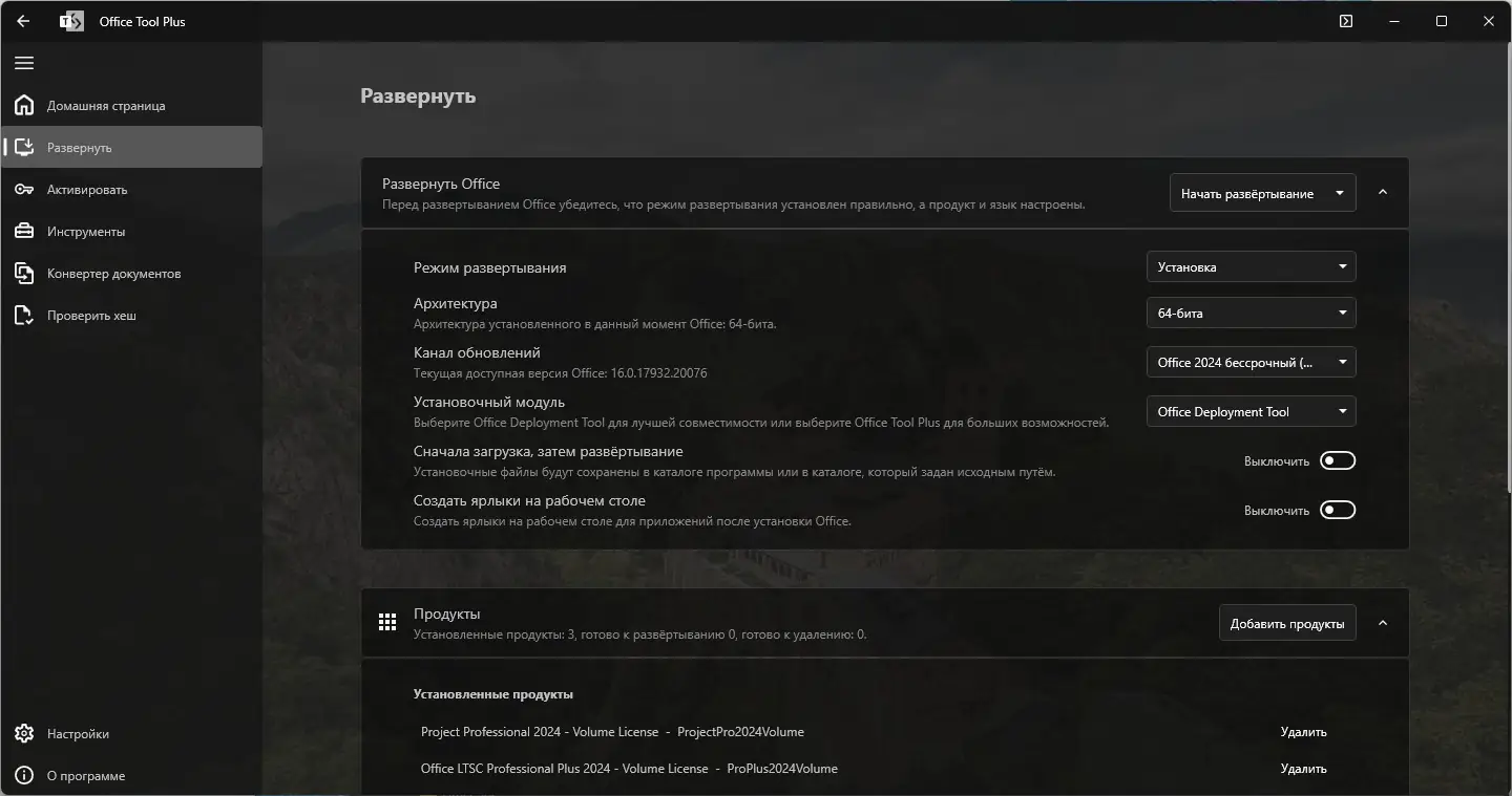 Office Tool Plus представляет собой универсальное решение для управления продуктами Microsoft, включая Microsoft 365, Office 2016–2024, Visio, Project и другие. Программа позволяет не только установить или удалить офисный пакет, но и тонко настроить его состав, исключив ненужные приложения и языки. Это особенно полезно при работе на устройствах с ограниченным объемом памяти или при необходимости стандартизации конфигураций на множестве компьютеров. Интерфейс приложения интуитивно понятен и разделён на логические блоки, что упрощает навигацию и доступ к нужным функциям.