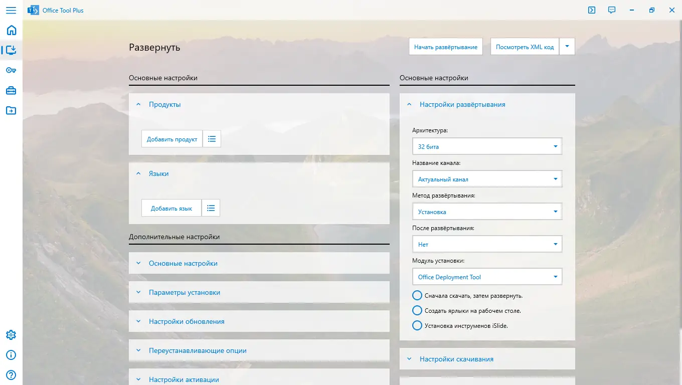 Работа с Office Tool Plus интуитивно понятна благодаря продуманному интерфейсу и логичной структуре разделов. После запуска exe-файла пользователь получает доступ ко всем основным функциям: загрузке, установке, изменению и удалению Office. Для настройки достаточно выбрать нужные компоненты, указать язык и версию, после чего начать процесс. Программа сама скачает необходимые файлы с официальных серверов Microsoft, обеспечивая безопасность и совместимость. Процесс как активировать лицензию также упрощён — доступны онлайн-активация, по телефону и через KMS-сервер, при этом ключ продукта можно задать вручную или импортировать из профиля.