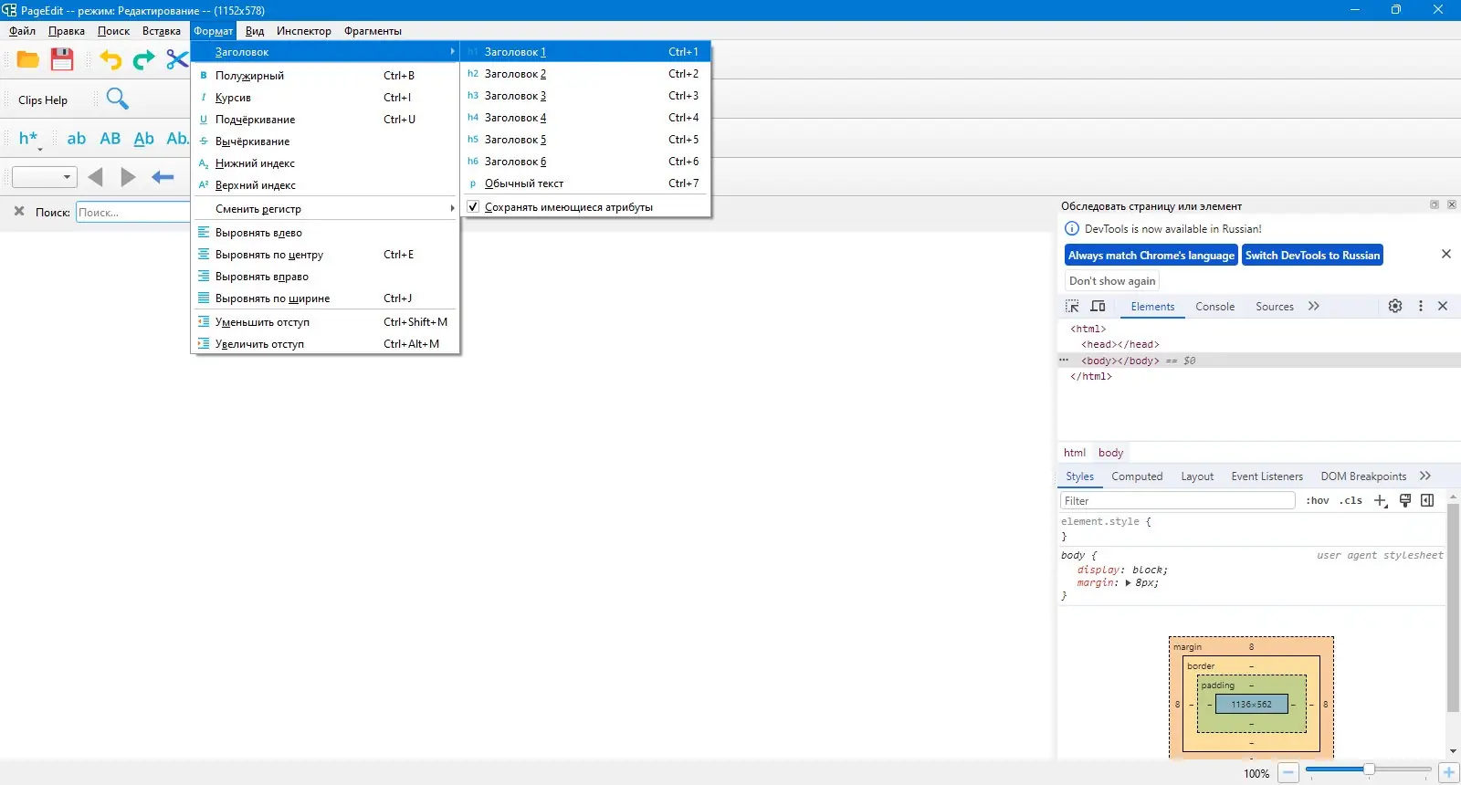 - Поддерживает редактирование как в визуальном, так и в кодовом режиме