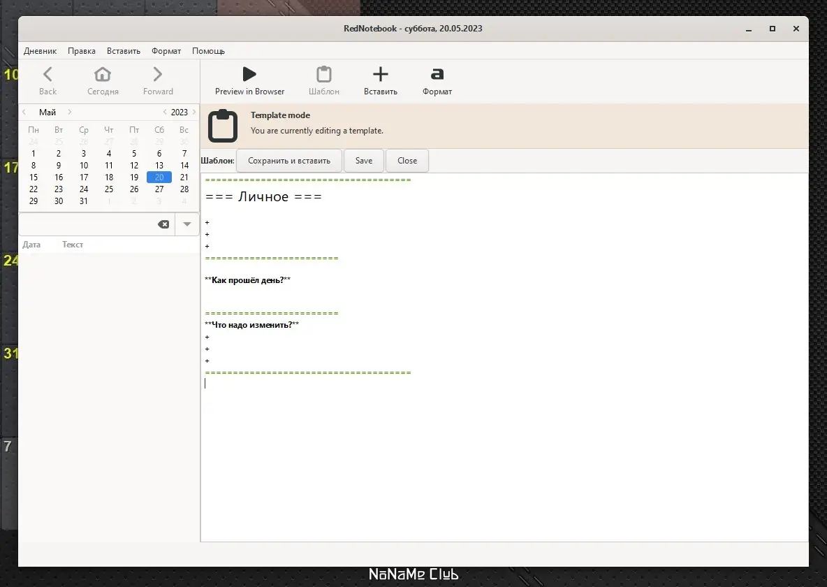 RedNotebook представляет собой приложение для ведения цифрового дневника, ориентированное на простоту и эффективность. Оно разработано с использованием технологий GTK+ и Gnome, что обеспечивает стабильную работу в различных окружениях рабочего стола. Интерфейс программы минималистичен, но при этом интуитивно понятен, не перегружен избыточными настройками и сразу готов к использованию после запуска.